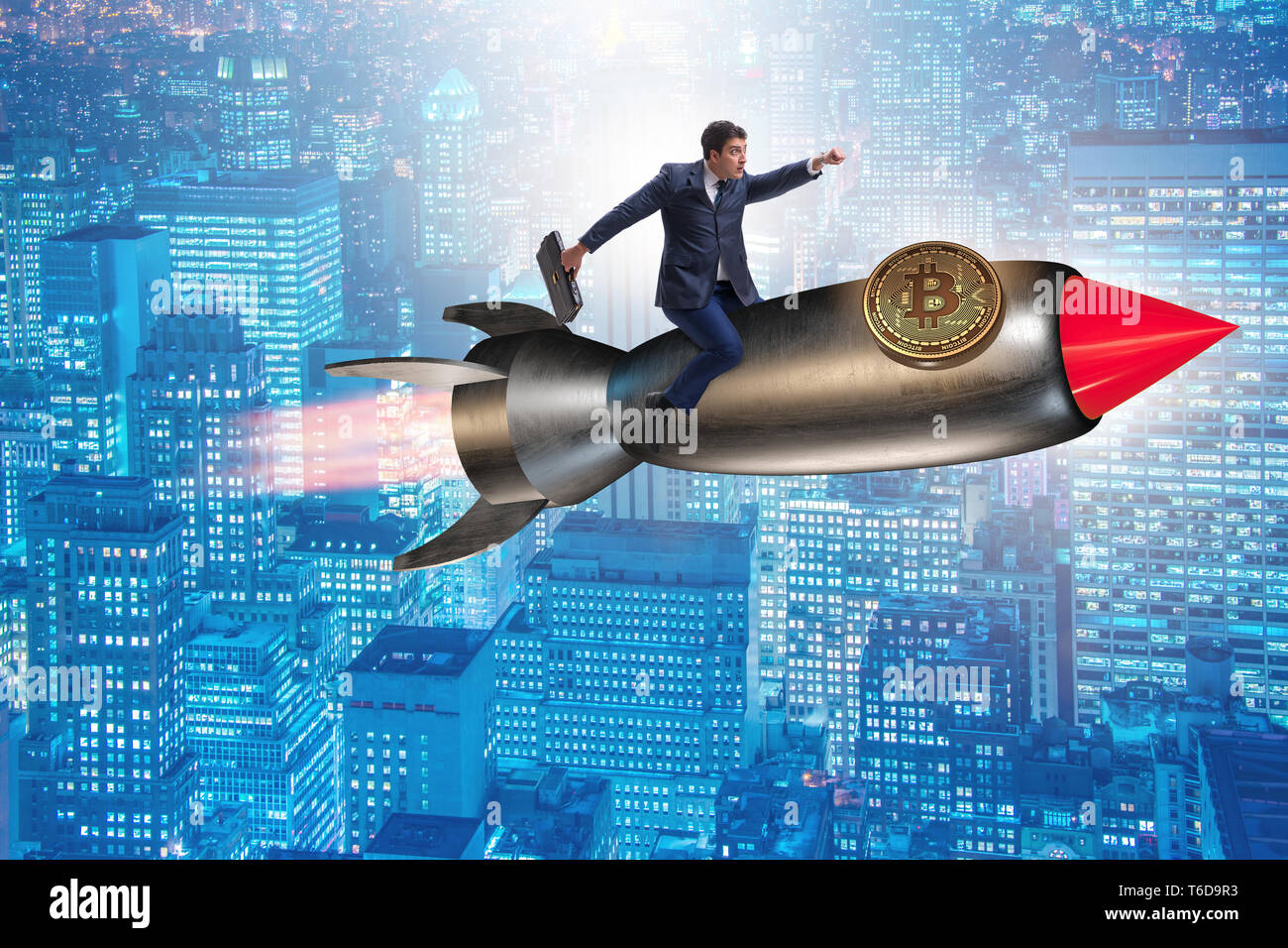 Businessman Flying On Rocket In Bitcoin Price Rising Concept Stock