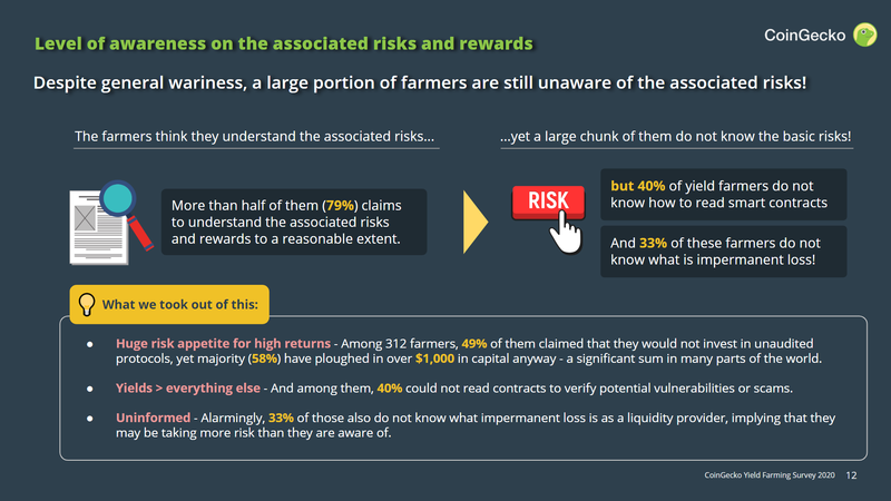 Coingeckos yield farming survey report dives into the field of yield farming. A very small subset of crypto users pursues yield farming but the trend is quickly catching up. There will be exposure to smart contract and market risks.