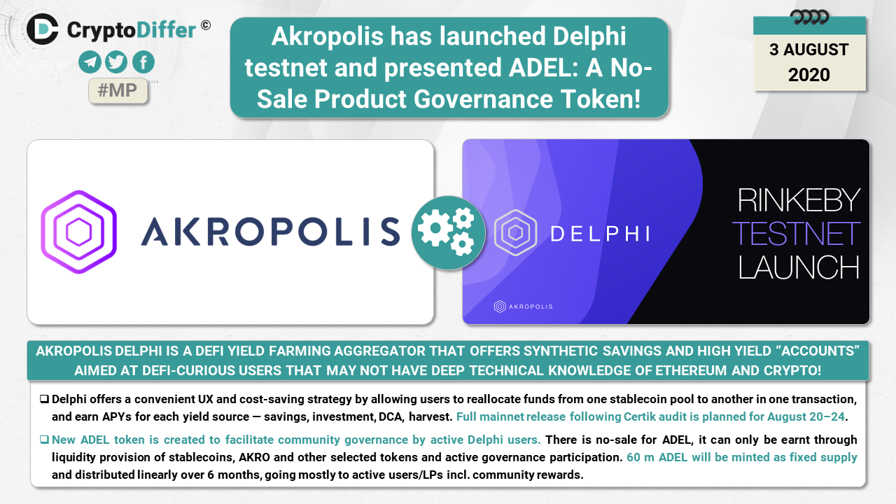 Cryptodiffer On Twitter Akropolisio Akro Has Launched Delphi Testnet And Presented Adel A No Sale Product Governance Token Akropolis Delphi Is A Defi Yield Farming Aggregator That Offers Synthetic Savings And High Yield